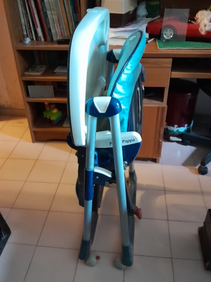 chaise haute pour bébé pliable sur roulettes et divers autres objets de puériculture