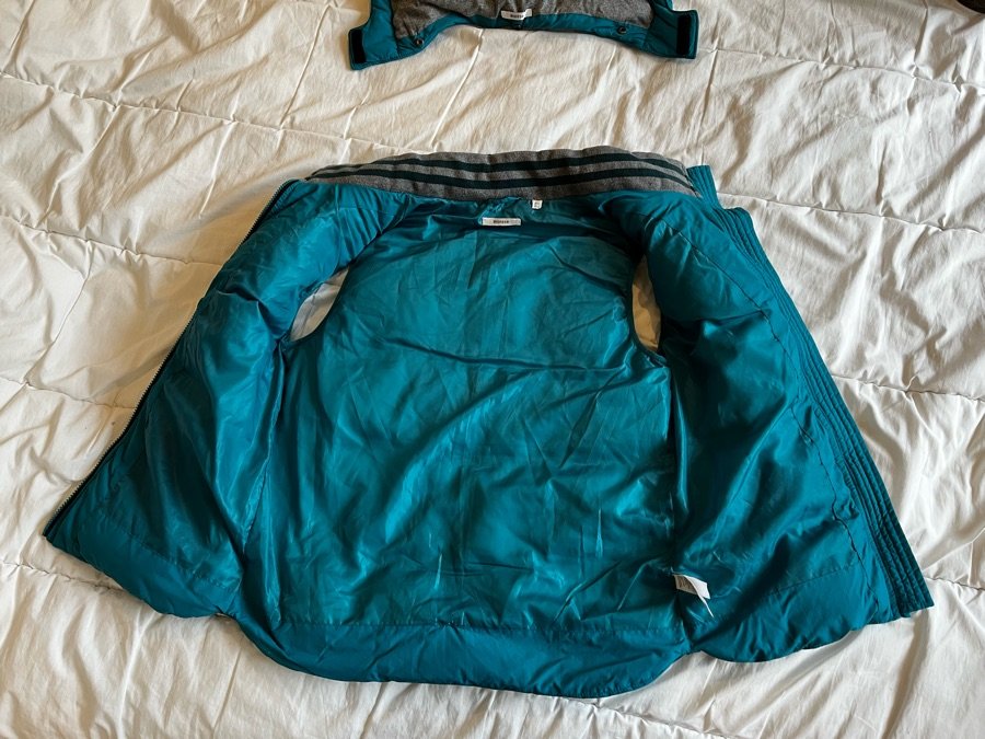 Veste bleue canard 14 ans, Matière épaisse et matelassée pour un confort optimal, Capuche intégrée amovible, Fermeture zippée centrale, Parfait état