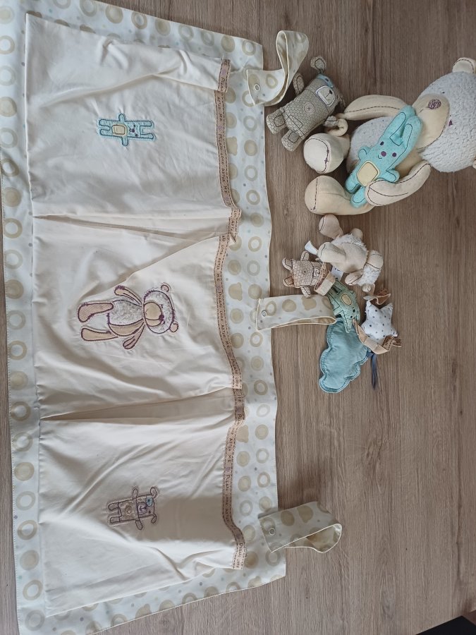 Porte couches (ou doudous...) en tissu avec 1 porte manteau Un ensemble avec 3 poches de rangement qui peut s’accrocher au lit Des doudous de la même collection qui s’accrochent au lit, poussette, transat, couffin ...