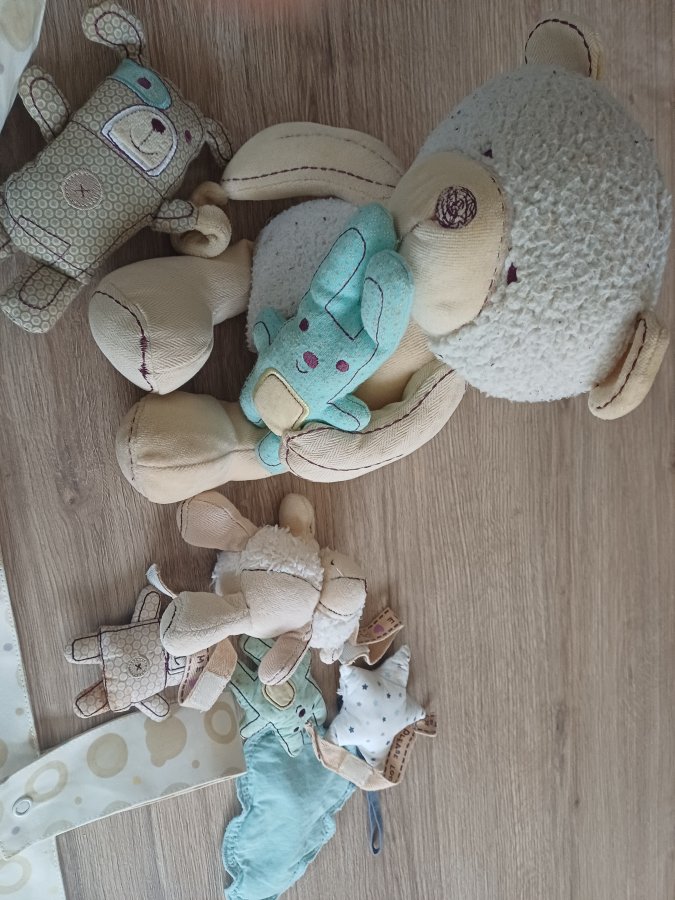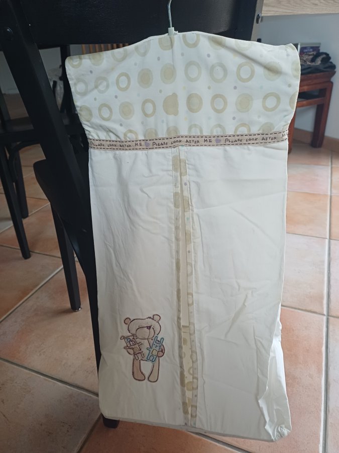 Porte couches (ou doudous...) en tissu avec 1 porte manteau Un ensemble avec 3 poches de rangement qui peut s’accrocher au lit Des doudous de la même collection qui s’accrochent au lit, poussette, transat, couffin ...