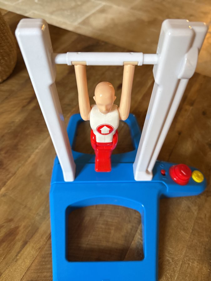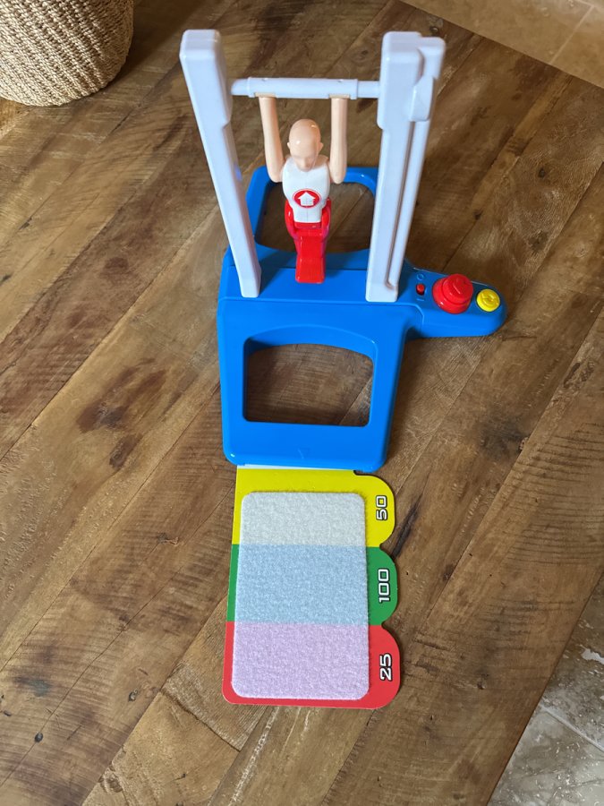 C'est très drôle. Bon état. Fonctionne avec 4 piles R6 non fournies. Il faut faire tourner le gymnaste et choisir le moment pour appuyer sur le bouton rouge et lui faire lâcher prise. Un coup parfait et il retombe debout. Objectif : marquer des point en le faisant tomber au plus près.