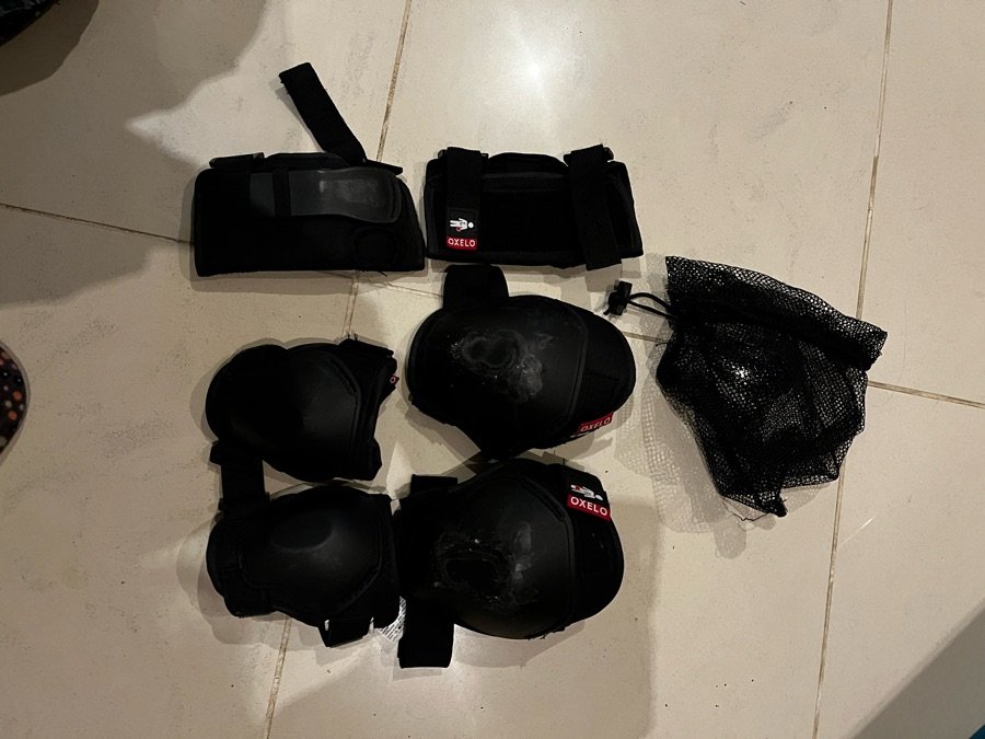 Genouillère, coudière et protection pour les main pour le sport (vélo, skate, trottinette…). Pour enfant 6/8 ans. Marque Decatlon. Taille XS. Plastique rayé, mais élastique, scratch et tissu intérieur en très bon état.