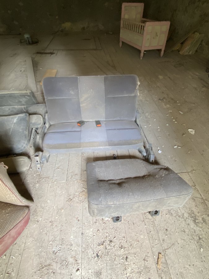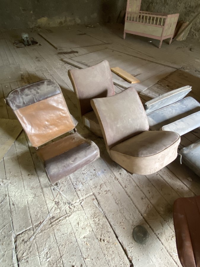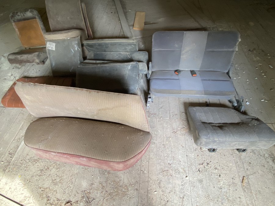 Divers sièges et banquettes de véhicules anciens, poussiéreux mais pas déchirés. Je n'ai aucun renseignement sur les modèles.