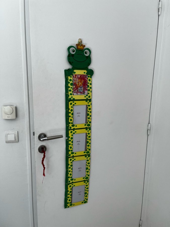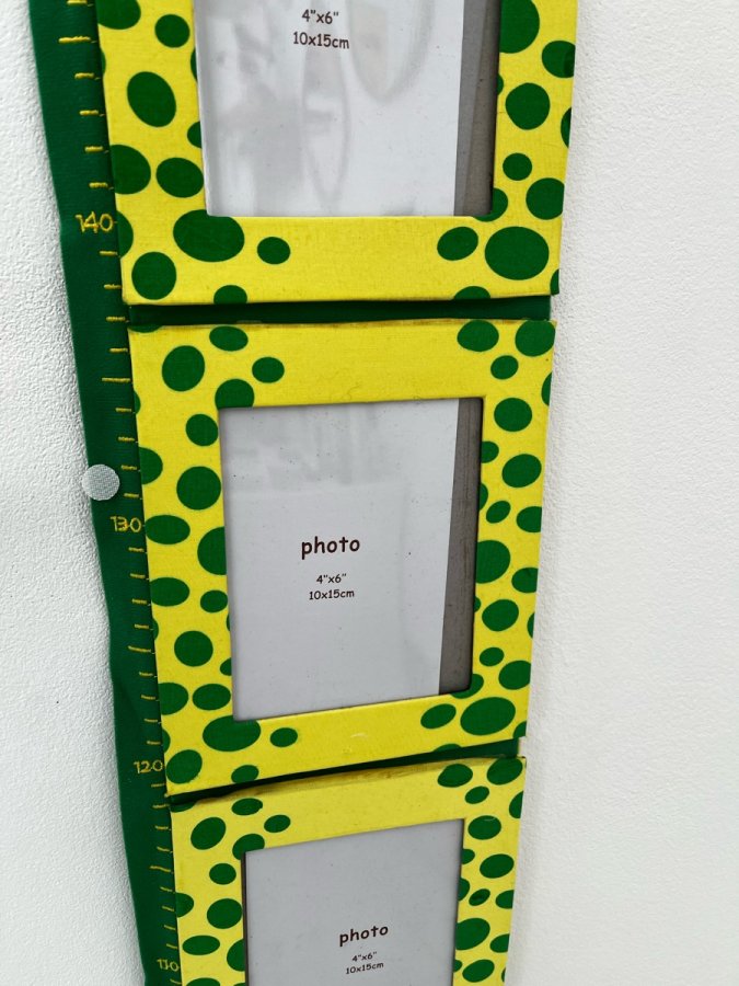 Une décoration utile ! Jolie toise en tissu, avec 5 cadres photo 10 x 15 cm, surmontés par la reine des grenouilles ! À accrocher sur un mur ou derrière porte